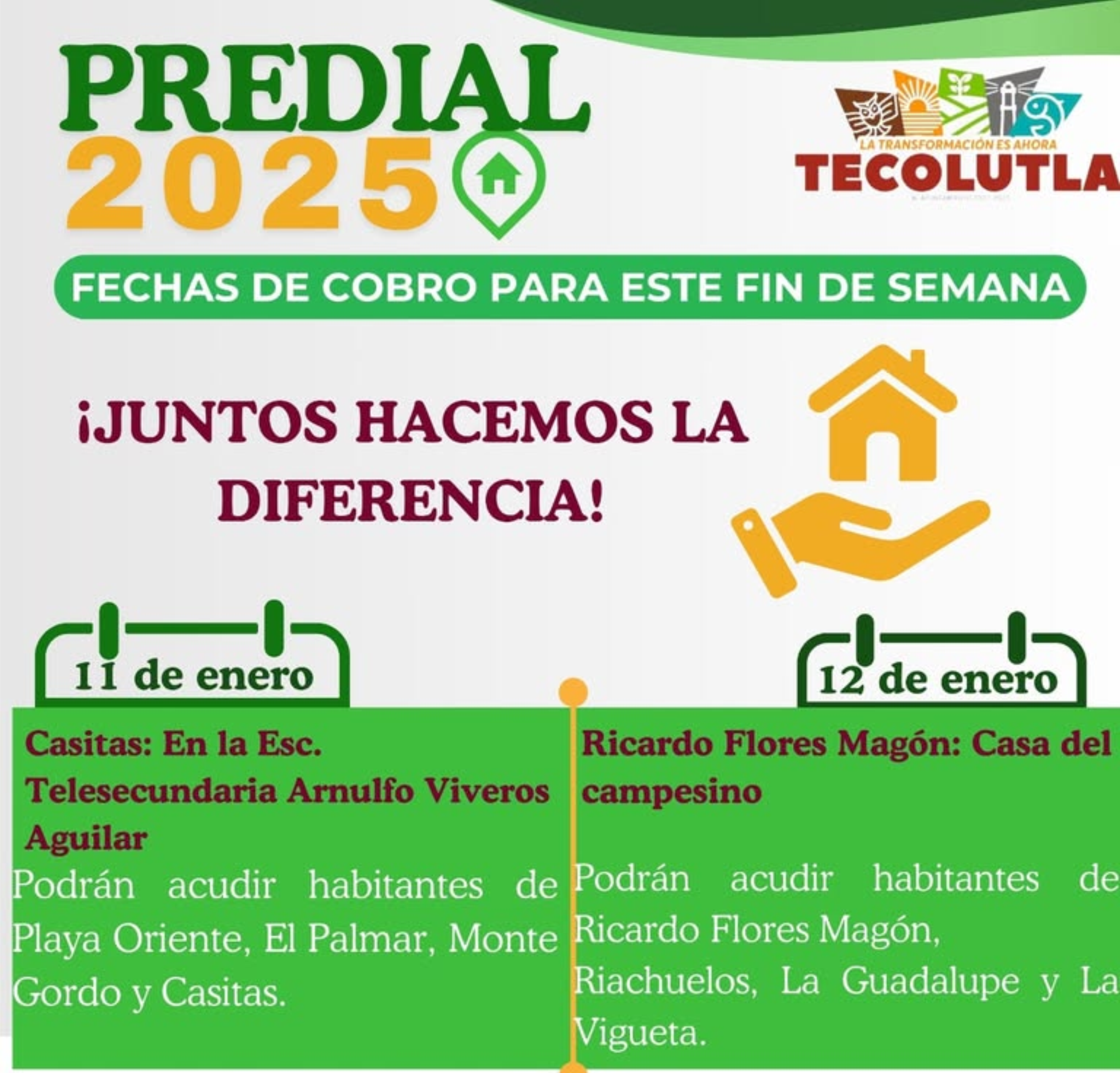 Tecolutla, Ver. – 9 de enero 2025. El Honorable Ayuntamiento de Tecolutla hace un llamado a la ciudadanía para aprovechar las jornadas especiales de pago predial que se llevarán a cabo este fin de semana en distintas localidades del municipio.