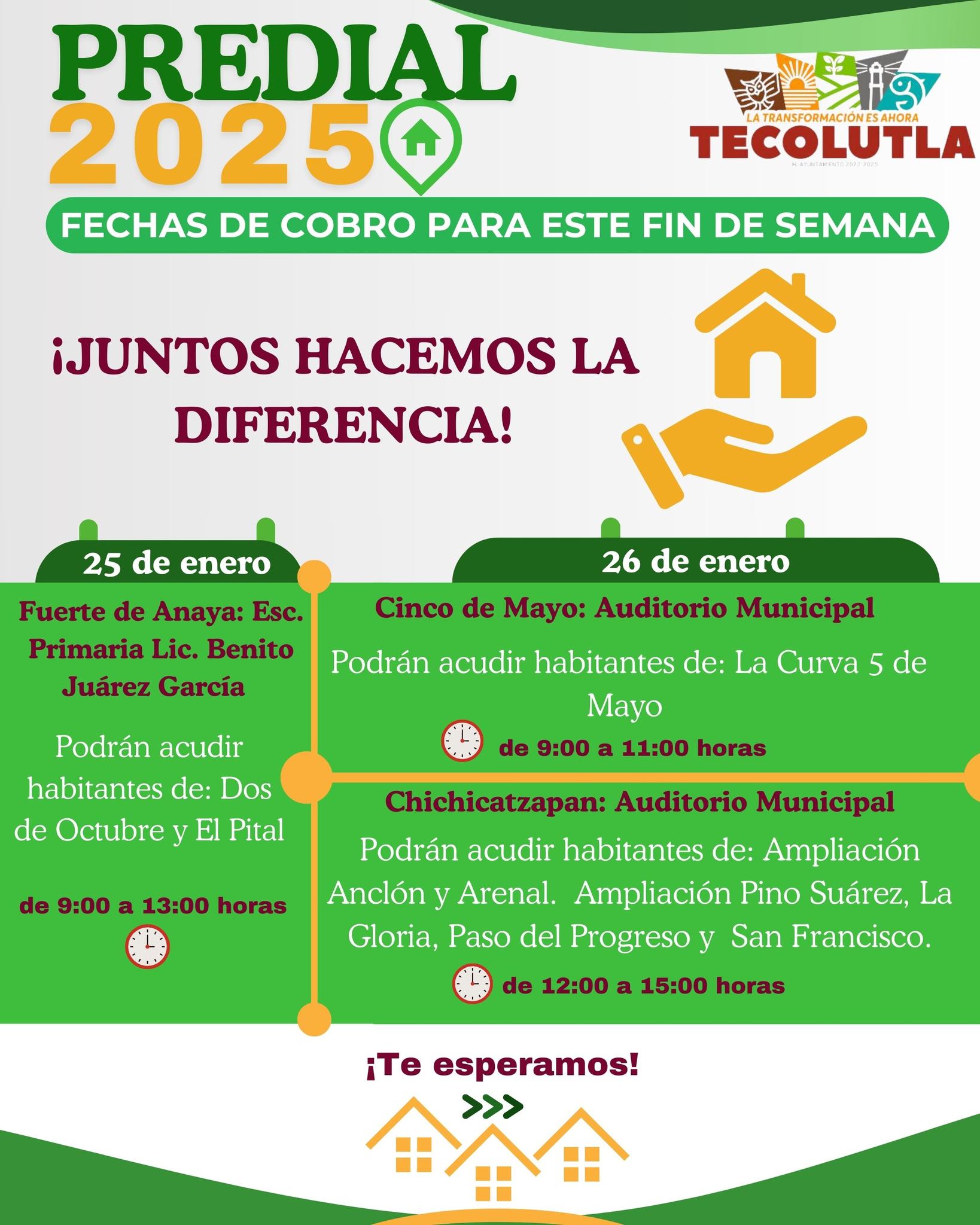 Tecolutla, Ver. 21 de enero del 2025.– El H. Ayuntamiento de Tecolutla hace un llamado a los ciudadanos a aprovechar este fin de semana para realizar su pago de predial en distintos puntos del municipio. Además, habrá personal de Comercio, Catastro y Zona Federal disponible para atender cualquier trámite o consulta que los contribuyentes requieran.