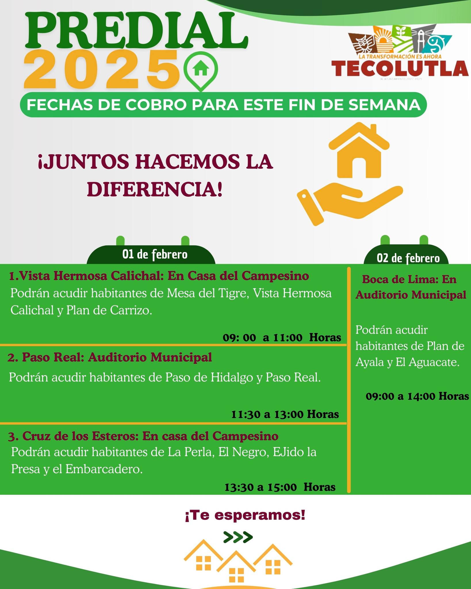 Tecolutla, Ver. 29 de enero del 2025 – Con el objetivo de facilitar el cumplimiento de obligaciones fiscales a la ciudadanía, el H. Ayuntamiento de Tecolutla llevará a cabo jornadas de pago predial en diversas localidades del municipio este fin de semana.