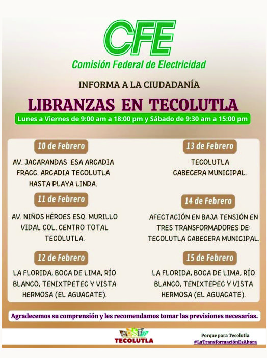 Tecolutla, Ver. 10 de febrero del 2025– La Comisión Federal de Electricidad (CFE) informó sobre una serie de libranzas programadas en diversas zonas de Tecolutla, con el objetivo de realizar trabajos de mantenimiento en la red eléctrica.