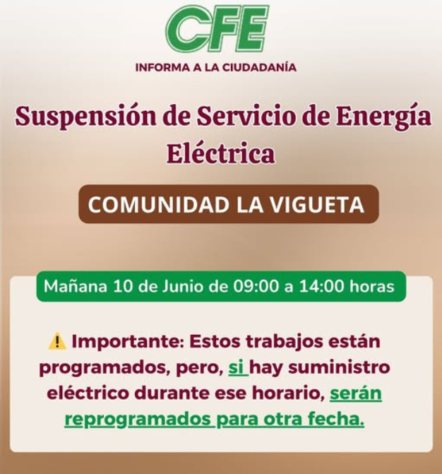 Tecolutla, Ver. 10 de junio de 2025.- La Comisión Federal de Electricidad (CFE) informa a la ciudadanía que se llevará a cabo una suspensión programada del servicio de energía eléctrica en la comunidad de La Vigueta el día lunes 10 de junio, en un horario comprendido de 09:00 a 14:00 horas.