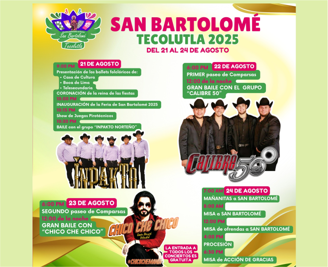 Con una programación variada y para todas las edades, Tecolutla se prepara para recibir a cientos de asistentes que, año con año, se suman a esta gran fiesta que honra al patrono San Bartolomé.