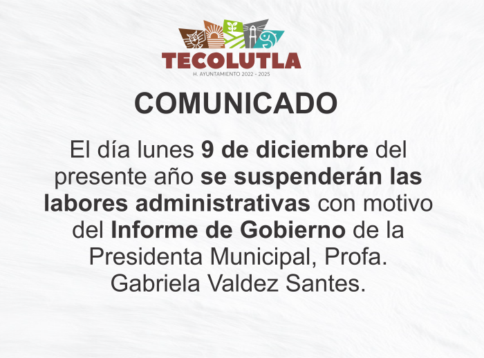 El H. Ayuntamiento de Tecolutla, Veracruz, informa a la ciudadanía que el día lunes 9 de diciembre del presente año se suspenderán las labores administrativas con motivo del Informe de Gobierno de la Presidenta Municipal, Profa. Gabriela Valdez Santes.
